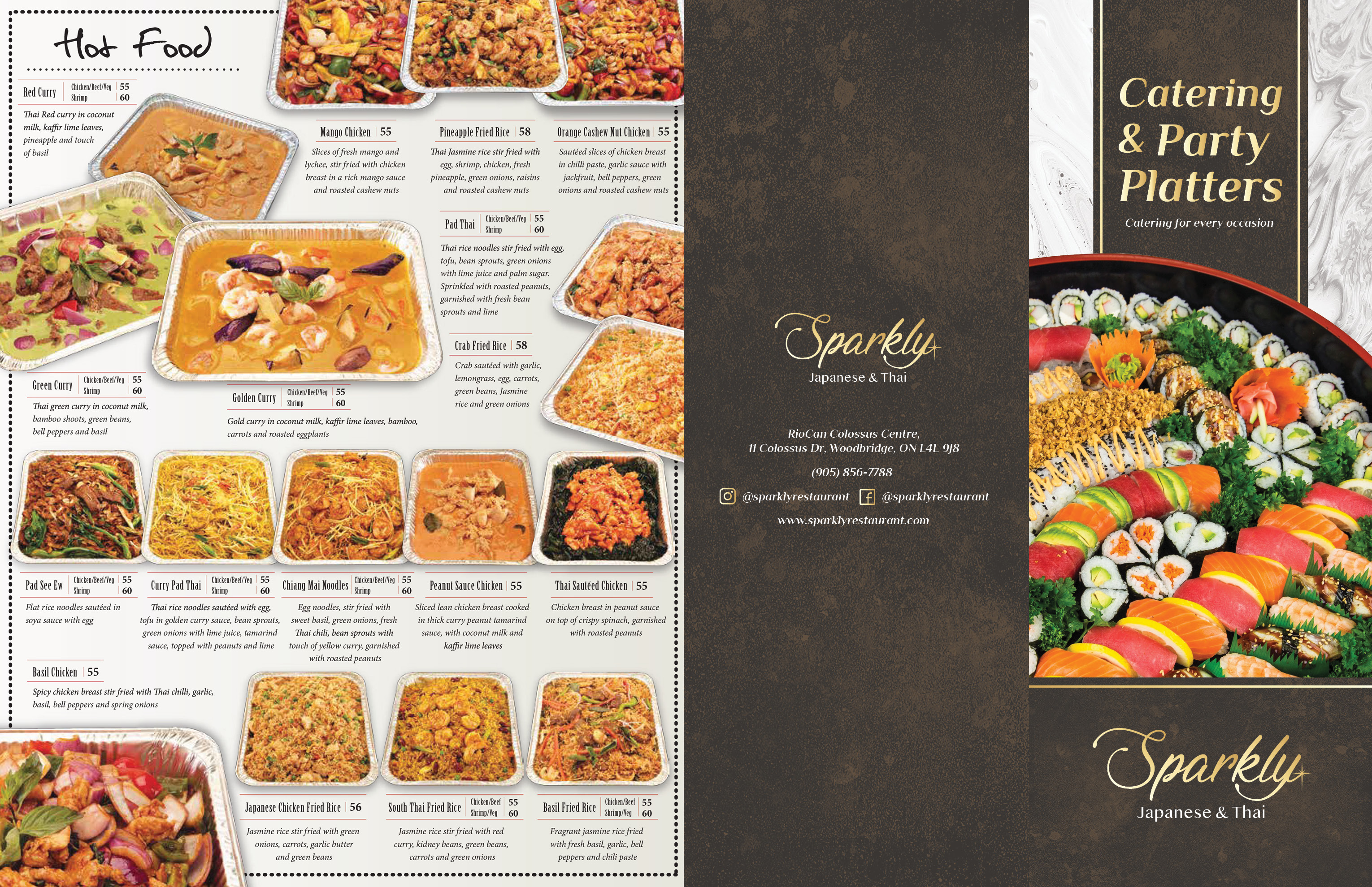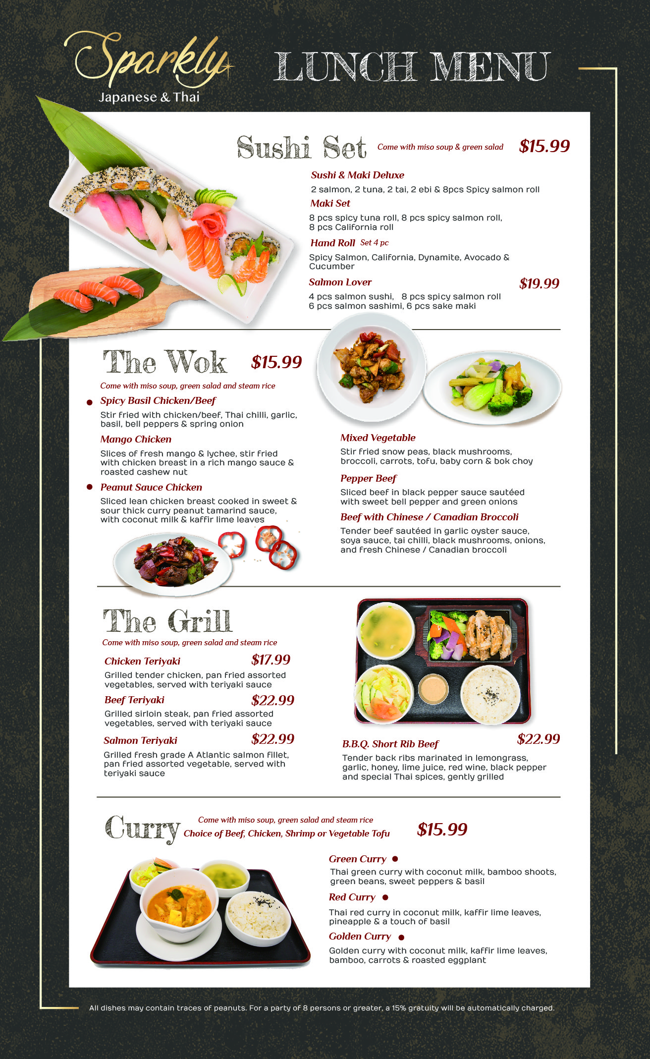 Curry prepared with chicken, beef or vegetable $18, tiger shrimp $19, seafood $20 with your choice of steamed rice or coconut rice
