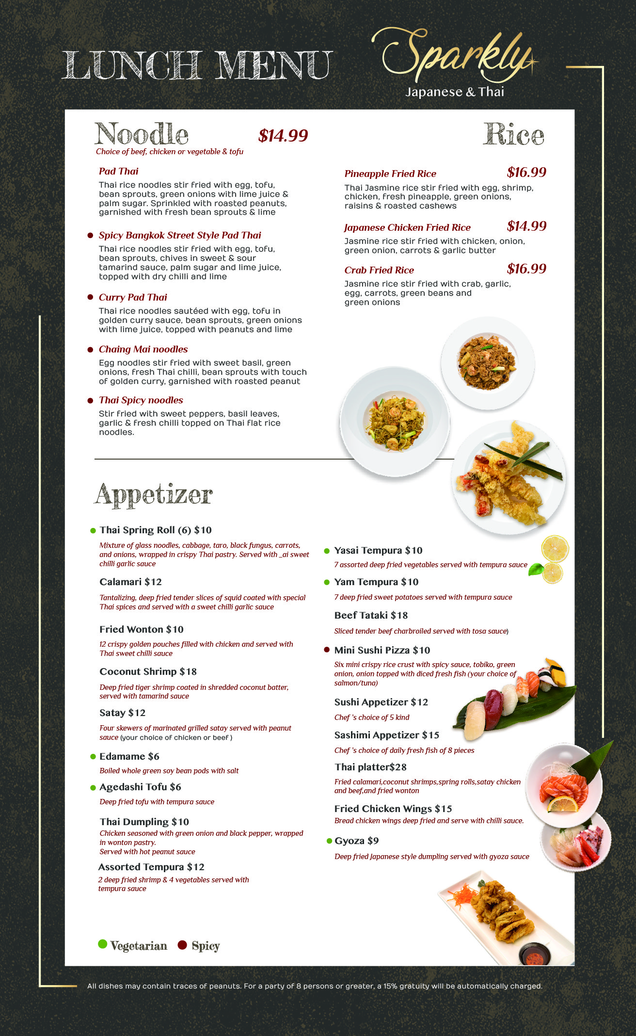 Stir fried noodles prepared with beef or chicken or vegetables $16 tiger shrimp and chicken $17 tiger shrimp $19
